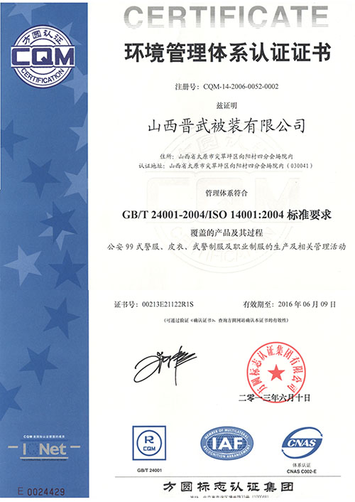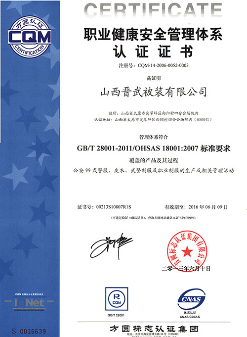 晉武被裝自1999年先后通過了ISO9001、ISO14001和OHS18001認證,并在2009年被獲得了“中國優質產品”證書,同時先后從日本、德國、美國引進先進的生產設備和先進的生產工藝,在2011年年初,我公司被評為“質量、服務、信譽AAA級金牌單位”。